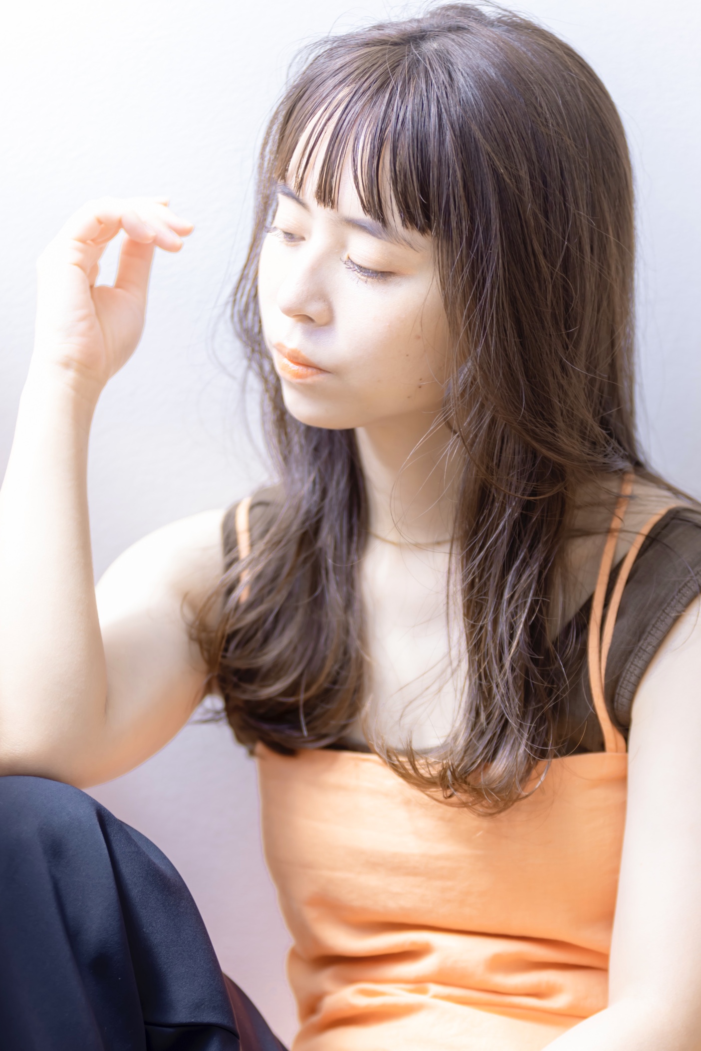 柔らかい質感のフェザーロング。空気を間に入れる質感調整のカットで、思わず触りたくなるような柔らかさをプラス。N .ポリッシュオイルでツヤを足して仕上げます。前髪にも束感を作るのがポイント。