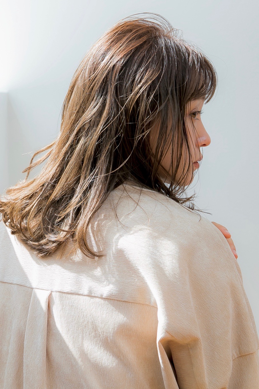シースルーバングと顔周りのレイヤーがポイントのミディアムスタイル。イルミナカラーで「ブランジュ」を表現しました。「N.ポリッシュオイル」を全体に馴染ませ、耳掛けで軽さをプラスします。